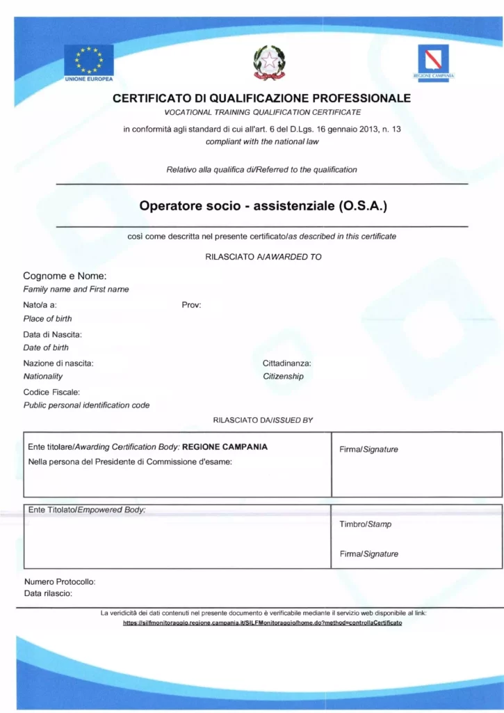 Al termine del percorso formativo, dopo aver superato l’esame finale, il corsista riceve il certificato finale riconosciuto e accreditato dalla Regione Campania, valido su tutto il territorio nazionale.